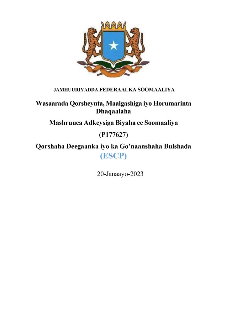 - Qorshaha ka qayb galka daneeyayaasha (SEP), qaab-dhismeedka maamulka bulshada ee deegaanka (ESMF), qaabdhismeedka siyaasadda dib-udejinta (RPF), taas oo loo diyaariyay mashuurca iyo.